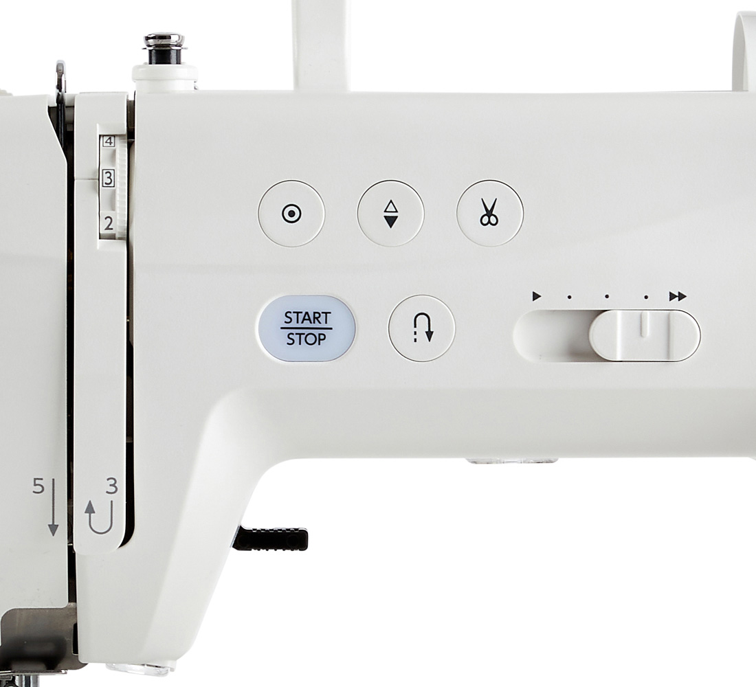 Suwak regulacji prędkości szycia występuje w maszynach komputerowych, wyposażonych w przycisk START/STOP. Sporadycznie tę funkcję można spotkać w zaawansowanych modelach maszyn mechanicznych. Za pomocą suwaka kontrolujemy prędkość, z jaką maszyna szyje po naciśnięciu przycisku startowego. Możemy ją dowolnie regulować w trakcie pracy. Suwak może posłużyć również jako ograniczenie maksymalnej prędkości szycia podczas pracy z podłączonym rozrusznikiem nożnym.