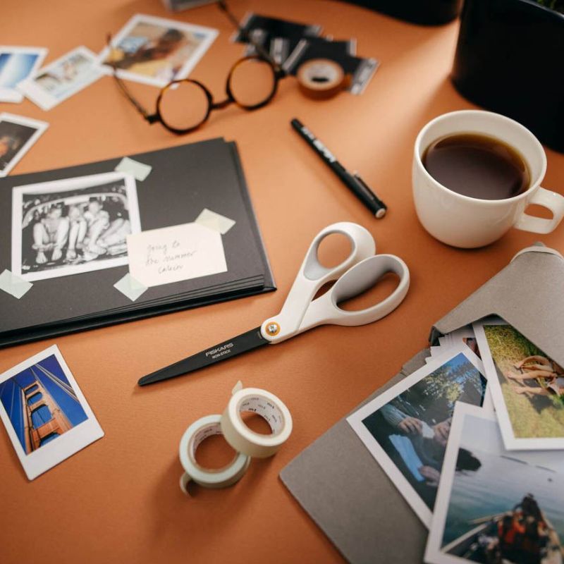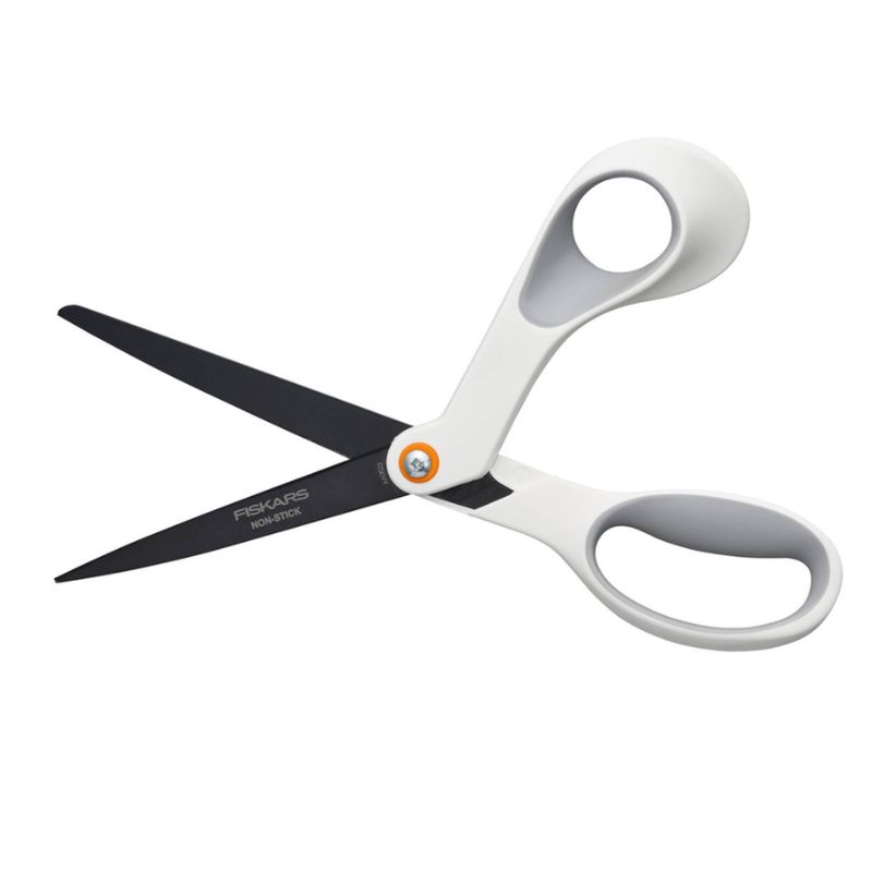 Nożyczki uniwersalne Fiskars Titanium Non-stick o długości 21 cm są idealne do cięcia materiałów lepkich, pokrytych klejem, jak np. taśmy klejące, naklejki, tkaniny czy flizeliny z klejem.